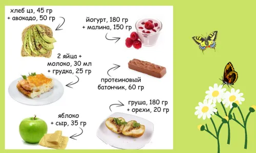 Представленные на картинке варианты перекусов я рекомендую употреблять в первой половине дня, во время первого перекуса.