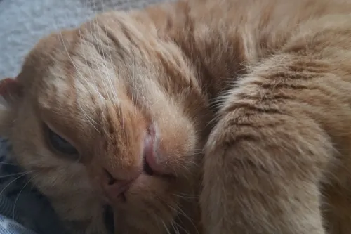Когда я пошла готовить свой первый завтрак, Кузя спал. Приготовила, сижу - наслаждаюсь и тишиной, и вкусом завтрака. Смотрю Кузя пришёл, лежит на полу, жмурится, песенку негромко поёт, а кушать не просит.