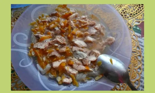 На фото: в суповой тарелке бульон, в котором тушилась горбуша, а во второй тарелке - сам кусок горбуши, который я очищу от кожи и костей, разделю на кусочки мяса и добавлю в бульон.