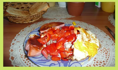 В показанном завтраке: гречневая запаренная каша (без масла) + поджаренное яйцо + поджаренный кусок колбасы + красный сладкий перец.