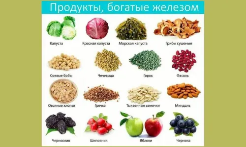 источники железа (кратко): Красное мясо, мясные субпродукты, рыба, морепродукты, рыбные консервы, сливочное масло, растительное масло, куриные яйца, овощи, мед, фрукты, различные крупы, белые грибы, персики, абрикосы (курага).