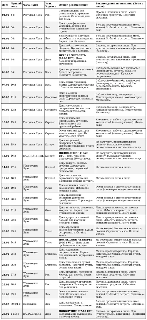 Луна в Скорпионе: легко переесть, поэтому важно соблюдать меру и прислушиваться к организму. Еда схожа с рекомендациями для Овна (легкоперевариваемая), но острую пищу можно не исключать, так как Скорпион – водный знак. Повышенная потребность в жидкости – налегать на воду, отказаться от кофе, чая, алкоголя, энергетиков.