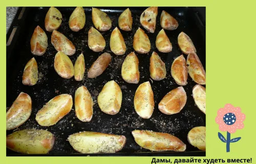 Смотрите какая красивая и вкусная, запеченная в духовке картошечка в мундире получается к обеду! Я её просто, хорошенько вымыв, нарезала на дольки, обсыпала всякой сухой зеленью и в духовку. А уж к этой картошечке годится всё, что душеньке угодно: свежие овощи, котлеты и мясо, рыба.