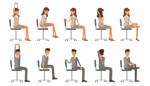- Скручивания на стуле: Сядьте прямо, положите правую руку на левое колено и мягко поверните корпус влево. Задержитесь на несколько секунд. Повторите в другую сторону. Улучшает гибкость позвоночника.