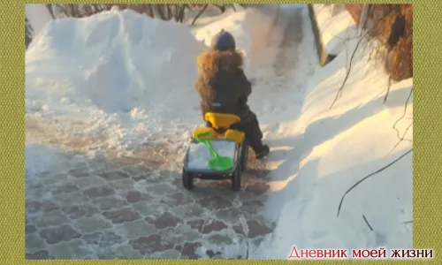 Убирали снег, у Димульки есть трактор с тележкой - вот он в эту тележку нагребёт с дорожки лопаточкой снега и вывозит на грядку. Тоже целая игра для него! С улицы не загонишь домой!