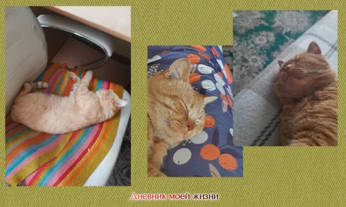 Утром, в 6 часов, я вновь пошла кормить Рекса и опять увидела этого котика. А стоял очень сильный мороз, ветер! Я решила предложить котику зайти погреться и позавтракать. Открыла ему дверь в сени - зашел, в дом - зашел. Повела его за собой на кухню - идёт. Все наши 4 уже живущие у нас котика собрались как на кино, а Рыжик, не обращая на них никакого внимания, снова жадно съел порцию мяса, вылизал миску со сметаной, закусил "Феликсом". Я взяла его на руки и показала лоток. Он тут же сходил и, буквально по пятам следуя за мной, прошёл в мой рабочий кабинет (условно, конечно, но место, где стоит мой компьютерный стол, книжные шкафы, принтер и ноутбук, рабочее кресло и так далее), я, похлопав ладонью по креслу, предложила ему полежать в нём - кресло стоит у батареии и потому в нём всегда тепло, Рыжик, которого я уже окрестила Кузей, тут же запрыгнул в него, умостился и уснул. Потом он перешёл на поверхности мебельной стенки и спал уже там, вытянувшись и расслабившись.