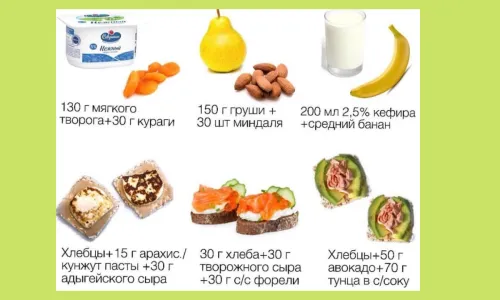 Представленные на картинке варианты перекусов я рекомендую употреблять в первой половине дня, во время первого перекуса.