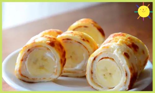 3. На готовый блин выкладываем-намазываем оставшийся творог и целый, очищенный, банан. Сворачиваем в рулет. Нарезаем на роллы. Всё. Вкусный перекус готов.