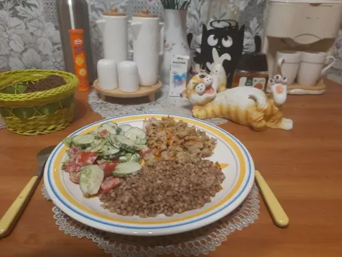 Ужин: гречневая каша (запаренная, не варёная) + салат из свежих овощей (листья салата, помидоры, огурец), заправленный сметаной + соус болоньезе из домашнего фарша индейки, моркови, лука, чеснока, черного перца:
