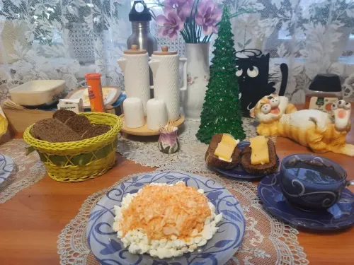 На завтрак сегодня: творог зерновой «Село Зелёное» 5% + салат сверху шапочкой из свежих моркови и дайкона, заправленный майонезом: очень люблю есть творог именно так – с каким-либо салатом. Хлеб «Дарницкий» с небольшим количеством сливочного масла и сыром «Российский» + кофе черный (без подслащивания).