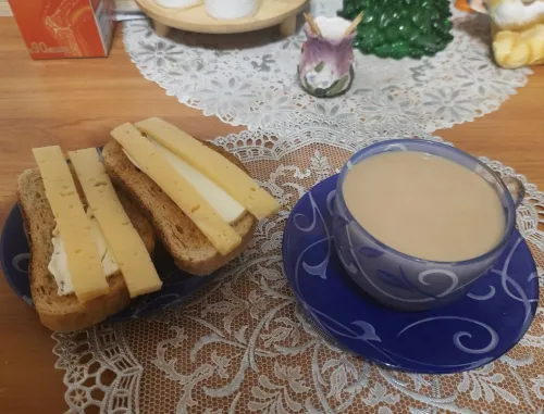 Что традиционно входит в мой первый завтрак? - напиток с цикорием (сегодня я добавила чуть молока, а обычно пью горький, без добавок). И два кусочка хлеба с отрубями + немного сливочного масла и твердый сыр.
