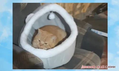 Это Кузя. Купили на пробу такую корзиночку-домик для хвостиков специально для улицы. Поставили в старое кресло, живущее во дворе и стали ждать: понравится-не понравится?