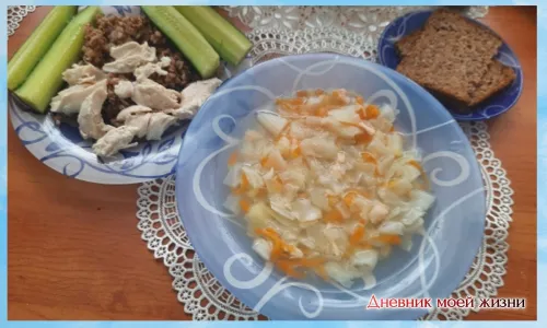 Обед: щи со свежей капустой и мясом индейки как первое блюдо: