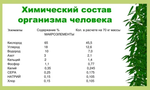 А вообще почти 99% массы человеческого тела состоит из шести элементов: кислорода, углерода, водорода, азота, кальция и фосфора. Только около 0,85% состоит из еще пяти элементов: калия, серы, натрия, хлора и магния.