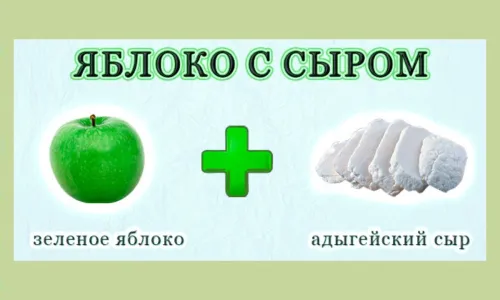 Состав перекуса: Адыгейский сыр - 10 г, зеленое яблоко - 1 штука (весом примерно 150 грамм).