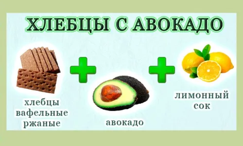 Состав перекуса: Хлебцы вафельные ржаные – 2 штуки (~6 г), авокадо – 37 г и лимонный сок – 5 мл.