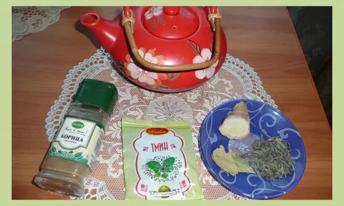 на 0,5 литра воды берем 1 чайную ложку натертого на мелкой терке имбиря. Добавляем 2 лавровых листочка, 0,5 чайной ложки тмина и 0,5 чайной ложки корицы. Доводим до кипения, варим 30 минут. Добавляем щепотку зеленого листового чая. Настаиваем 10-15 минут. Процеживаем и принимаем.