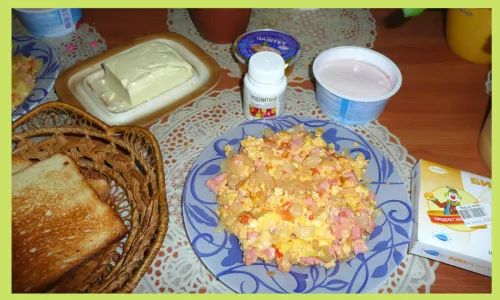 яичница с колбасой категории А, которую я периодически покупаю (она, конечно, дорогая - около 600 рублей, но килограммами я не покупаю, а всего 200 грамм и она иногда украшает своим вкусом наш завтрак), итак, это яичница с колбасой, большим количеством лука, помидоры, а сверху натертый сыр, которым я обсыпаю своё блюдо в конце приготовления: как только расплавилось - всё: блюдо готово.