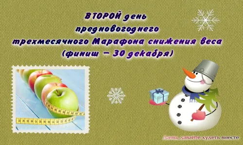Итак, у нас с вами ВТОРОЙ день Марафона снижения ЛИШНЕГО веса, а финиш - 30 декабря: успеваем и темп правильный набрать, и к цели (правильно вами намеченной) дойти победителями! (ссылка на первый день - в конце статьи).