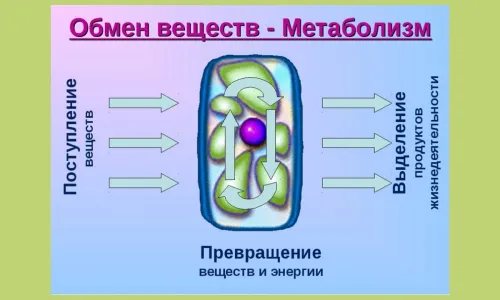 Метаболизм (обмен веществ) - это, как следует из картинки, преобразование поступающих веществ в другие (нужные организму) и энергию - так происходит ОБМЕН веществ.