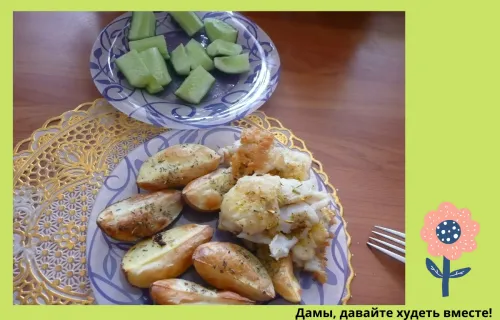 На фото мой обед с этой самой картошечкой, а к ней филе камбалы, тоже запеченной (не жареной) и огурчики.