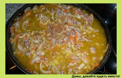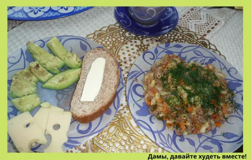 напомню как я готовлю по кадрам: тушу лук и морковь, как правило, в бульоне - добавляю любой фарш, кроме свиного -довожу практически до готовности и в это время добавляю сырые (не отваренные) макароны твердых сортов пшеницы - заливаю бульоном или водой - добавляю специи - макароны по-флотски готовы (как видите макароны не разварились)-обед готов! На фото ещё и хлеб с маслом, сыр Маасдам и авокадо и кружечка с кофе - так как это у меня завтрак, но это исключение из правил - обычно это блюдо готовится именно на обед.