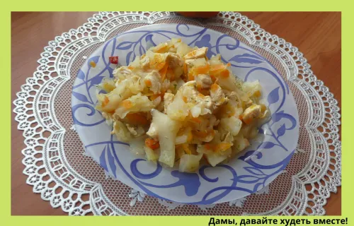 У меня - тушеная капуста с куриным мясом. Совсем не обязательно тушить с мясом, можно просто потушить овощи, а к ним - паровые котлеты. Разве члены вашей семьи откажутся от такого обеда? Я думаю, что нет, не откажутся.