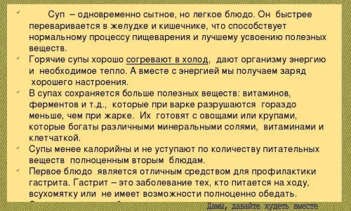 Вот так получилось длинно о полезности супов для облегчения процессов пищеварения, но примеры из жизни всегда помогают более доходчиво донести важную информацию.
