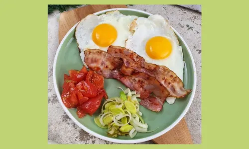 яичница-глазунья с беконом или ветчиной, с помидорами,
