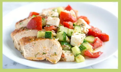 тушеное, запеченное или приготовленное на пару куриное филе с овощным салатом,