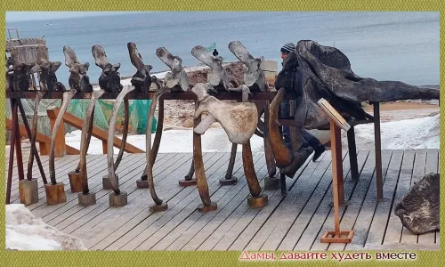 У ресторана стоит скелет кита, который выбросился на берег. Кости собрали, перевезли и установили в поселке.