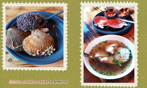 В ресторане я впервые ела гребешка и морского ежа. Я любитель рыбы, и мне понравился вкус этих деликатесов. Дорого, конечно, ( по 250р за штуку), и содержимое гребешка на один укус, а ежа - 5 кофейных ложечек, но попробовать стОило!😉