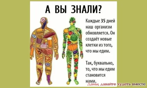 Я взяла эту картинку из интернета и не знаю, насколько верна информация в ней отраженная, имею в виду указанные 35 суток, но то, что именно наша с вами еда, преобразованная, переваренная, расщепленная до молекул - это основа формирования КАЖДОЙ клетки нашего организма - это да! это так!
