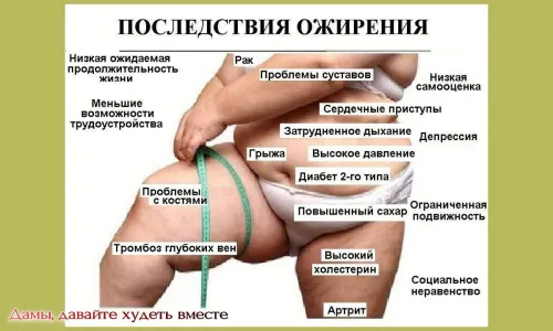 3. Далее за этим начинаются проблемы с сердечно-сосудистой системой. А как же иначе? Нарушение как работы органов пищеварения, так и наступившее ожирение вызывают всевозможнейшие гормональные нарушения, нарушение липидного обмена и так далее. А давайте-ка я картинку прикреплю, которая наглядно демонстрирует КАКИЕ неприятности наступают вслед за ожирением: